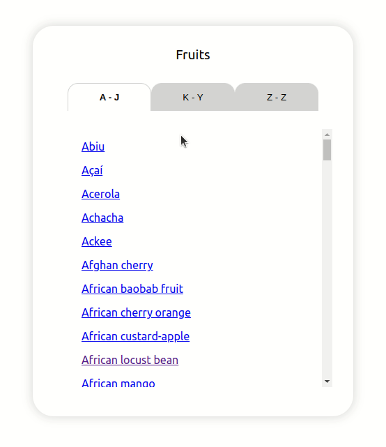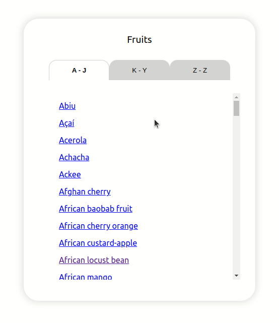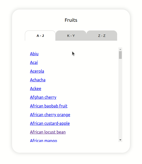 다음과 같이 탭을 이동하여 알파벳 순으로 정렬된 과일 이름을 볼 수 있습니다.