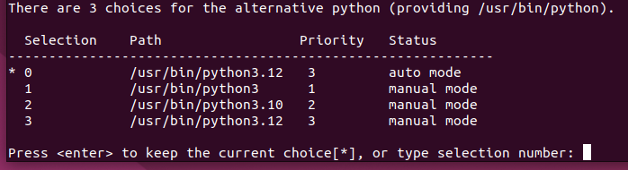 sudo update-alternatives --install /usr/bin/python python /usr/bin/python3.12 3
